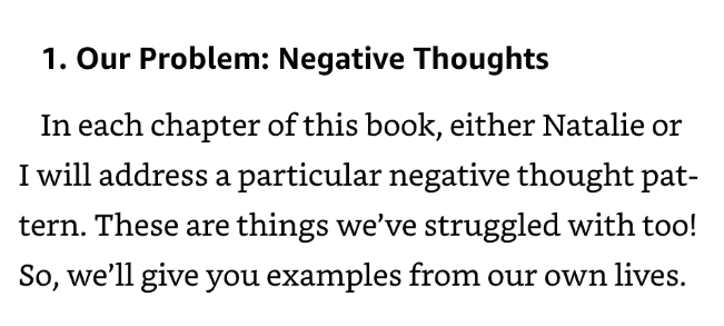 2. Our problem: They write, “Our Problem: Negative Thoughts. In each chapter of this book, either Natalie or I will address a particular negative thought pattern. These are things we’ve struggled with too! So, we’ll give you examples from our own lives.” Source- Kindle version location 199.