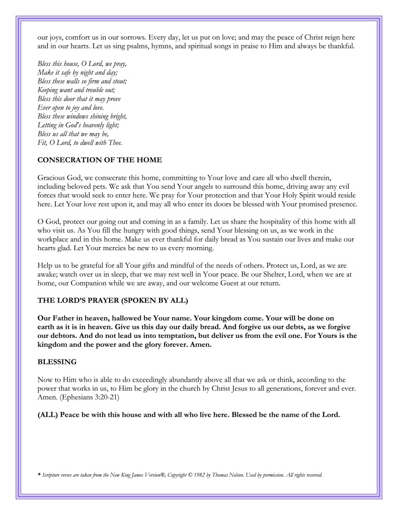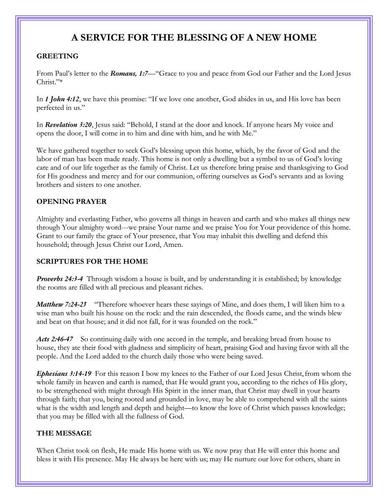 After marriage, my beloved husband and I have moved several times to other homes, as have our parents and adult children, and we’ve taken the house blessing to each one. Along the way, I found a church blessing service and modified it for a home, with Bible verses to read aloud together (shared below).* We have even conducted some of our house blessings online on our computers!